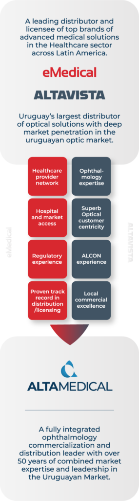 AltaMedical is a full-service licensee, importer, and distributor focused on revolutionizing the eye care sector in Latin America. We leverage decades of experience through a joint venture between Altavista, a leader in optical products in Uruguay, and eMedical, renowned for its expertise in hospital equipment and medical devices.